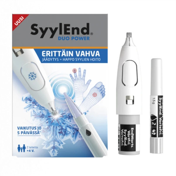 SyylEnd® DUO POWER yhdistää kaksi eri syylänpoistomenetelmää, jäädytyshoidon ja happohoidon. Kynät on suunniteltu helppoon ja nopeaan käyttöön koko perheelle 4-vuotiaasta alkaen. Aikuisen pitää aina hoitaa lapsen syylät. Jäädytyshoito perustuu lääkäreiden yleisesti käyttämään jäädytysmenelmään, joka jäädyttää nopeasti syylän ytimen. Happokynässä on trikloorietikkahappoa sisältävää tiivistettä, joka saa syylän kuoriutumaan.