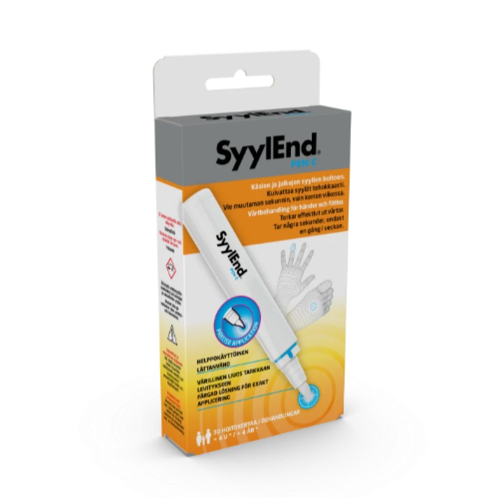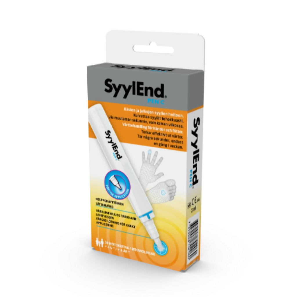 3 mlSyylEnd® PEN C on moderni ja tehokas syylänhoitomenetelmä, jossa käytetään värillistä liuosta. Liuos on helppo annostella muutamassa sekunnissa. Tuote soveltuu koko perheelle syylien poistoon käsistä, jaloista, kyynärpäistä ja polvista.
