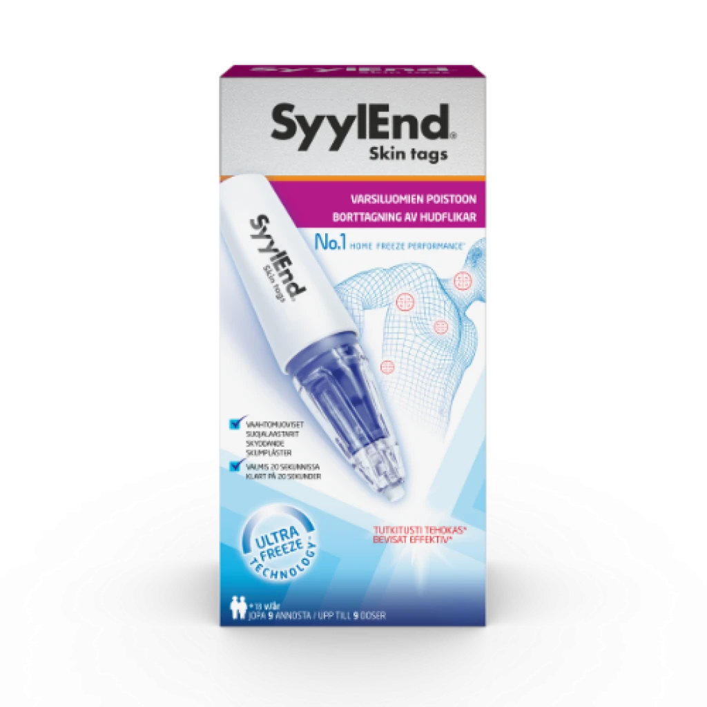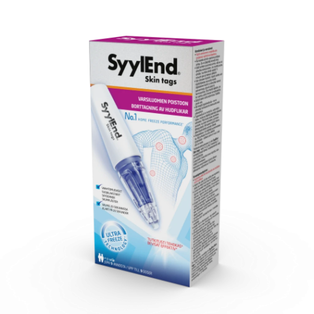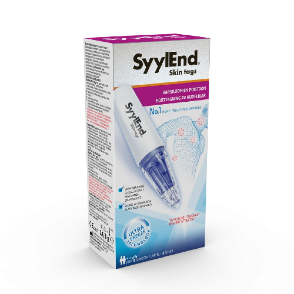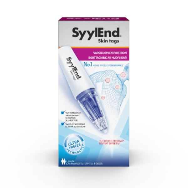 SyylEnd Skin tags on ensimmäinen kotikäyttöön tarkoitettu varsiluomien hoitomenetelmä, jossa käytetään hyvin kylmää kaasua, typpioksiduulia. Se jäädyttää ihosolut −80°C: seen. Jäädytysmenetelmää varsiluomien poistossa käyttävät myös ihotautilääkärit. Lue huolellisesti pakkauksen käyttöohje ennen tuotteen käyttöä. Varsiluomi häviää vähitellen 14 päivän kuluessa. Jos näin ei tapahdu, toista hoito. Laite riittää jopa 9 hoitoannokseen.